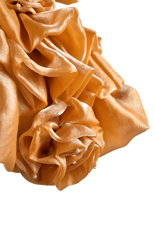 Elevate imagination with the Golden Rose Couture Dress, where golden satin and rose embellishments with pearl droplets capture a regal fairy-tale glow.