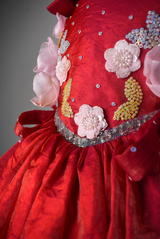Embrace whimsical elegance in the Regal Red Fairy Frills Dress, featuring pink floral 3d applique and shimmering sequins for a princess-like charm.